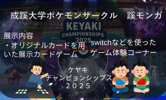 【展示】 成蹊大学ポケモンサークル 蹊モンガ 体験 展示名:ケヤキチャンピョンシップ2025 展示内容:ポケモンに関するゲームやカードゲームなど 展示場所:8号館304教室 紹介文: オリジナルイラストのポケモンカードの展示や、ポケモンバトルの体験を実施します! どなたで...