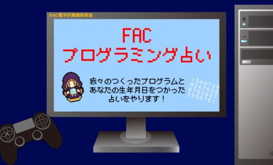 【展示】 FAC電子計算機研究部 展示 展示名:FACプログラミング占い 展示内容:プログラミングで作成したサイトで、お客様を占う 展示場所:9号館204教室 紹介文: 我々FAC電子計算機研究会は、パソコン部のような部活です。今年も恒例のプログラミングを用い...
