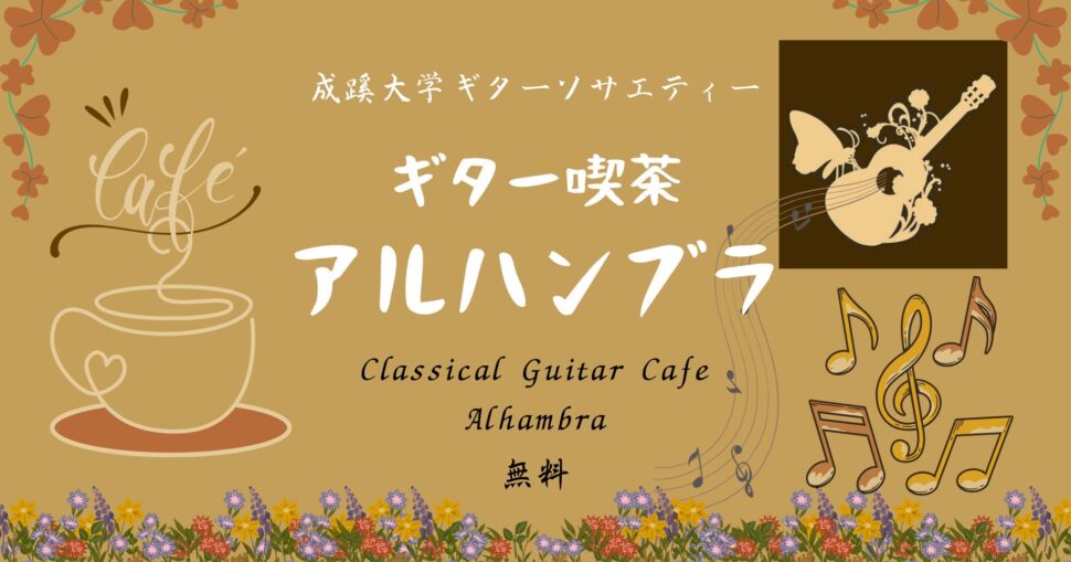 ホーム イベント 展示 体験 【展示】 ギターソサエティー EVENTイベント 【展示】 ギターソサエティー カテゴリー: 体験 展示 展示名:ギター喫茶アルハンブラ 展示内容:部員によるクラシックギター生演奏が聴ける無料休憩室です。無料でお菓子やお茶の配布も行います。 展示場所:9号館404・405教室 紹介文: 昨年同様、教室でギター演奏を行っております。様々なジャンルの曲を演奏していますので、ぜひ休憩がてら気軽にお立ち寄りください。 【模擬店】 体育会合氣道部 【模擬店】 應援指導部チアリーダー部