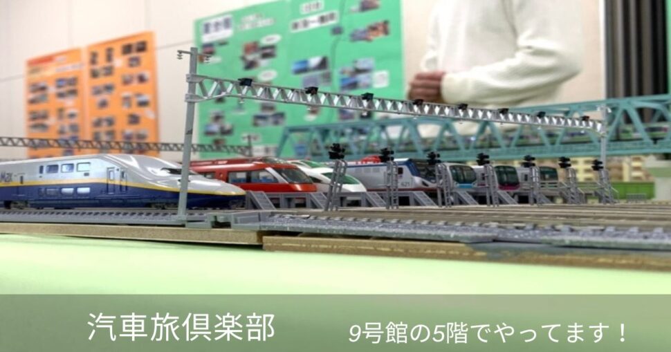 ホーム イベント 展示 体験 【展示】 汽車旅倶楽部 EVENTイベント 【展示】 汽車旅倶楽部 カテゴリー: 体験 展示 展示名:汽車旅倶楽部 展示内容:Nゲージ展示・活動内容紹介 展示時間:11月22日(土)、23日(日)10:00~19:00 展示場所:9号館502教室、503教室 紹介文: 鉄道模型が実際に動かせる展示です!ボタンひとつで電車が走るワクワク体験。鉄道好きも、初めての人も、みんなで楽しめるコーナーです。気軽に遊びに来てくださいね! 【模擬店】 成蹊大学学生ボランティア本部Uni. 【模擬店】 成蹊大学体育会アーチェリークラブ
