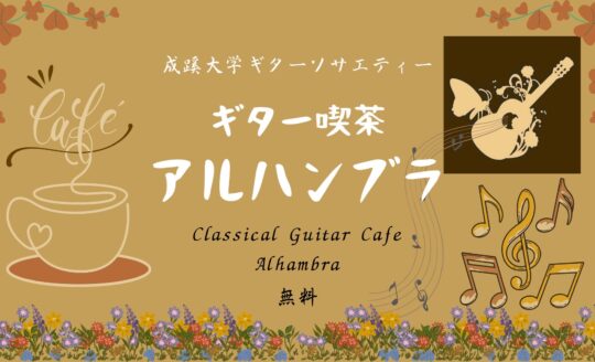 【展示】 ギターソサエティー 体験 展示名:ギター喫茶アルハンブラ 展示内容:部員によるクラシックギター生演奏が聴ける無料休憩室です。無料でお菓子やお茶の配布も行います。 展示場所:9号館404・405教室 紹介文: 昨年同様、教室でギター演奏を行っており...