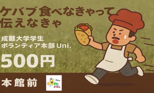 【模擬店】 成蹊大学学生ボランティア本部Uni. 出店名:ケバブ食べなきゃって伝えなきゃ 出店内容:ケバブ 出展場所:6番テント 紹介文: 主に地域でのボランティア活動を行う成蹊大学学生ボランティア本部Uni.では、昔から伝統の味を受け継いだケバブを販売します。