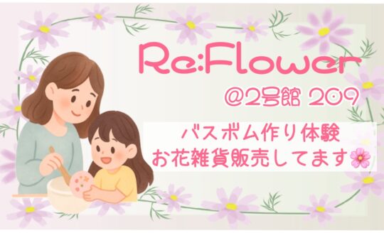 【展示】 北川ゼミ1班 体験 展示名:Re:Flower 展示内容:バスボム作り体験と、花雑貨販売 展示時間:11月22日(土)、23日(日)10:00~19:00 展示場所:2号館209教室 紹介文: 「花の命、もう一度かがやく瞬間を。」 バスボム...